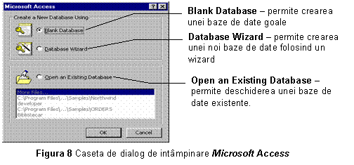 Atunci când deschideti o sesiune Microsoft Access, pe ecran se afiseaza caseta de dialog Microsoft Access ce contine optiuni care va permit sa creati o baza de date noua sau sa deschideti una deja existenta (vezi figura 8). Pentru a crea o baza de date folosind un wizard, executati clic pe optiunea Database Wizard si apoi executati clic pe butonul OK.