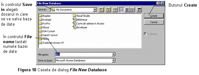 In caseta de dialog File New Database (vezi figura 10) selectati dosarul in care se va salva baza de date si tastati numele acesteia.
