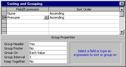 Pentru a adauga un nivel, executati clic intr-un rand alb din coloana Field Expression si selectati un camp din lista derulanta. Modificati proprietatea Group Header la valoare Yes pentru a adauga un antet de grup.