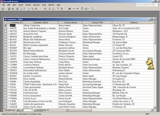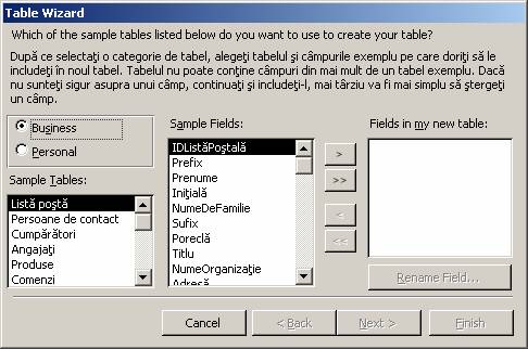 Fiecare din aceste grupe consta din mai multe tabele-exemplu, care pot fi alese dintr-o lista (Mailling list, Contacts, Customers, Employees, Products, Ovders, .), iar pentru fiecare tabel contine mai multe câmpuri-exemplu, care pot fi utilizate pentru viitoarele tabele (Customer ID, Company name, Contact first name, Contact last name, Company or department, Billing address, City, State or Province, Postal Code Country, .).