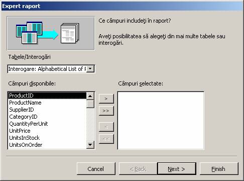 În partea superioara a ferestrei este afisata lista cu toate tabelele din care pot fi interogate date separate. Este posibil sa se lucreze cu mai multe tabele.