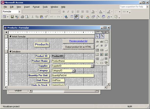 Formularul marcat se deschide, ca si tabelul aferent, prin executarea unui dublu clic pe formular, dupa selectare, si apoi clic pe butonul Open.