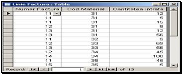 F. Linie Factura Numar Factura, Cod Material, Cantitatea intrata