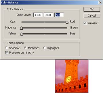 Color Balance. Imbunatatirea culorilor sau schimbarea gamei cromatice a unei imagini se poate realiza cu optiunea Color Balance (combinatia de taste Ctrl+B). Prin deplasarea cursorului spre una din culorile afisate, spectrul cromatic al imaginii se schimba. Se pot aplica de mai multe ori acelasi instrument pentru a obtine efecte mai clare in cazul unor imagini.