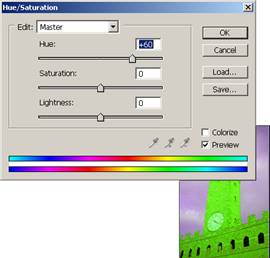 Hue/Saturation. Modificarea tonurilor se poate realiza si utilizand Image Adjustments Hue/Saturation. Se pot obtine efecte de saturatie a culorilor, luminozitate/inchis. Se poate deschide fereastra acestui instrument si prin apasarea tastelor Ctrl+U.