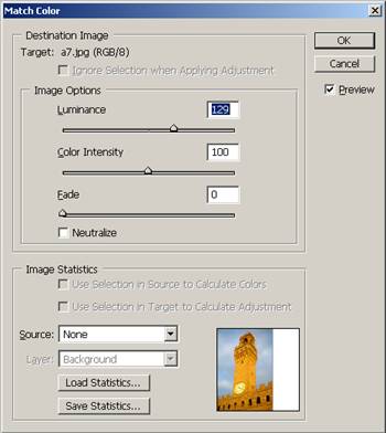 7 Optiunea Match Color se selectioneaza pe calea Image Adjustments. Se va deschide urmatoarea fereastra care permite imbunatatirea luminozitatii, intensitatea culorii, contrastul imaginii.