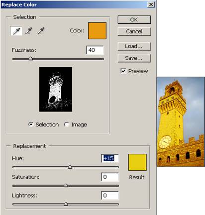 Replace Color. Culorile imaginii pot fi inlocuite sau modificate. Aceasta optiune se obtine deschizand fereastra Replace Color. Aici prin intermediul piker-ului se pot selecta culorile din imagine si apoi modifica/inlocui cu un alt ton, alta culoare.