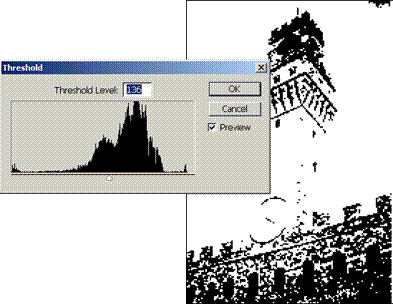 16 Threshold. Imaginea color poate fi transformata in imagine alb/negru, fara treceri de griuri prin optiunea Image Adjustments Threshold. Pixelii sunt evidenti iar trecerile din imaginea formata sunt bruste. Totusi aceasta imagine poate fi un bun suport pentru tehnica serigrafica.