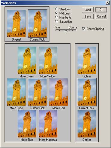 Variations. Una din cele mai bune modalitati de corectare a imaginii este preluata din meniul Image-Adjustments-Variations. Acesasta comanda permite ajustarea balantei, contrastului si saturatiei culorilor din intreaga imagine sau doar asupra unei selectii. Meniul are o interfata prietenoasa fata de meniul Curbe sau Niveluri (Levels). Prin apasarea icoanei alternative care arata cel mai bine, schimbarile se aplica automat. Exista imaginea initiala si alaturat imaginea asupra careia sau aplicat/se aplica schimbarile dorite de utilizator.