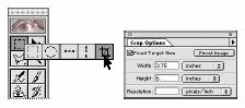1. }ineti apasat butonul stg. al mousului pe instrumentul de marcare rectangular din caseta cu instrumente si trageti catre Crop Tool pt. a-l selecta. Apoi executati dublu clic pentru a afisa Paleta sa de Optiuni, selectati “Dimensiune fixa” (Fixed Target Size si apoi introduceti dimensiunile dorite pentru imaginea ajustata – 3,75 inch (latime – width) pe 6 inch (inaltime – height).
