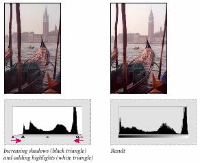 Observati histograma din aceasta caseta de dialog (ca in ilustratia de mai jos). Triunghiurile de dedesubtul histogramei sunt asociate cu zonele de umbra (shadows) – cel negru, cu zonele de lumina (highlights) – cel alb si cu zonele de ton intermediar sau asa-zis gamma – triunghiul gris. ~n cazul in care imaginea ar fi avut culori de-a lungul intregului domeniu de luminozitate, graficul s-ar fi extins pe toata latimea domeniului, de la triunghiul negru la triunghiul alb. ~n loc de ceasta, graficul este concentrar spre zona de mijloc, indicind ct imaginea nu contine culori foarte inchise ori foarte deschise.
