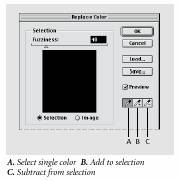 Se utilizeaza instrumentul pipeta (eyedropper) pentru a selecta zona de culoare care va fi mascata si inlocuita cu o culoare noua. Trei instrumente de acest tip sunt prezente in caseta de dialog.