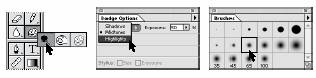 3. Alegeti dimensiunea si forma instrumentului (feathered = difuz) din caseta Brushes (pensule), ca in figura de mai jos.