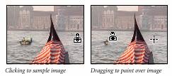 5. Aplicati instrumentul stampila peste barcuta pe care doriti sa o acoperiti cu copia zonei de apa pe care tocmai ati prelevat-o. Observati cursorul in forma de cruce care apare in timp ce utilizati instr. stampila; acesta reprezinta punctul din care instr. stampila preleveaza (esantioneaza) imagine.
