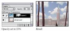 6. Pentru stratul nou adaugat (cu nori) schimbati opacitatea introducand valori de la tastatura, intre 1 si 100 (observati modificarile; se recomanda valoarea 55%).