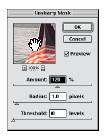 1. (Meniu) Filter > Sharpen > Unsharp Mask. Asigurati-va ca este marcata optiunea Preview (previzualizare) asa incat sa se poata observa efectul inainte de a-l aplica. Pentru a avea o informatie mai buna plasati pointer-ul in interiorul ferestrei de previzualizare si “trageti” pentru a vedea diverse zone din imagine. Se poate folosi si facilitatea de marire / micsorare apasand butoanele + si - de dedesubtul ferestrei de preview.