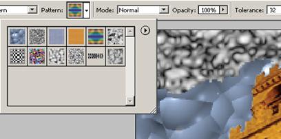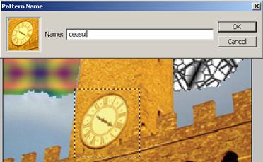 Pattern Stamp Tool se utilizeaza atunci cand dorim sa umplem o anumita suprafata cu o textura definita (imprimata deja). Se selectioneaza textura din bara de optiuni si se aplica in acelasi fel ca si Clone Stamp. |