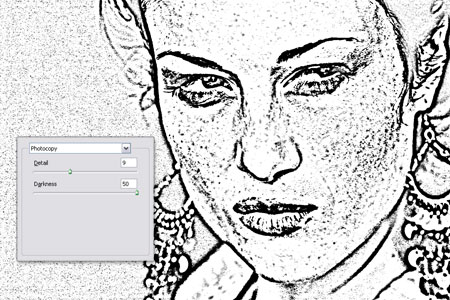 Aceasta tehnica de desenare cu linii combina accentuarea de baza a contururilor cu hasurarea incrucisata. Meniul Filter ofera mai multe tipuri de accentuare a contururilor, dar eu prefer (pentru acest tip de lucrare) Photocopy. Pentru mai multa flexibilitate, vei ap 434e42e lica Photocopy pe un layer independent. Apasa combinatia de taste : Ctrl+J pentru a trece imagine pe un nou layer. Apasa tasta D pentru a reseta culorile de suprafata/de fundal in alb / negru, setarile implicite. Apoi alege meniul Filter -> Sketch -> Photocopy. Seteaza valoarea Darkness la maximum, 50. Apoi trage de cursorul valorii Detail pana ce obtii contururi puternice, uzual valoarea este in jur de 9 pentru o imagine cu 300 pixeli pe inch (ppi).