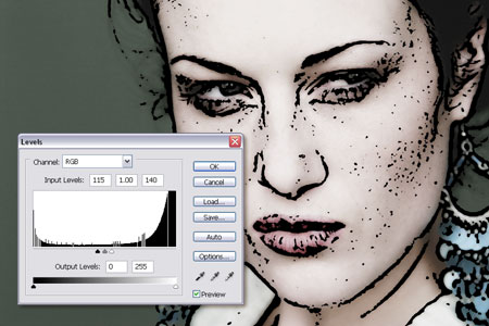 Alege meniul: Image -> Adjust -> Levels. Mareste valoarea primul Input Levels pentru a accentua negrul si micsoreaza valoarea celui de-al treilea Input Levels pentru a dilua albul. Eu am folosit valorile 115 (pentru primul) si 140 (pentru al treilea). Clic OK pentru a accepta modificarea. Dupa acest pas rezulta o imagine mai curata, dar nu curata de ajuns.
