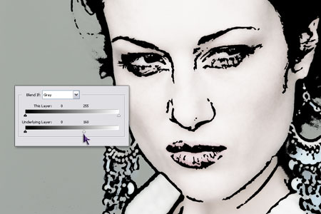 Acum este momentul sa umpli umbrele cu negru. Trebuie sa te gandesti ca aceasta operatie are nevoie de o selectie, dar selectia nu exista. Aceasta operatie este un pic cam tehnica dar beneficiaza de automatizare. Creeaza un alt nou layer si umple-l cu negru, prin apasarea combinatiei de taste Alt+Backspace. Da dublu-clic in dreapta numelui layer-ului negru,in paleta de layer-e pentru a activa caseta de dialog Layer Style. Mergi in jos la ultimul cursor, care este denumit Underlying Layer. Trage cursorul alb spre stanga pentru a forta patrunderea culorilor luminoase (deschise) din layer-ul de dedesupt in layer-ul de deasupra. Eu am tras cursorul pana cand valoarea din dreapta a ajuns la 160, cea ce inseamna ca negrul acopera nivelurile luminoase cu 160. Aceasta este totul la aceasta operatie. Clic OK pentru a iesi din caseta de dialog.