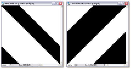 Pentru a forma efectul de hasurare incrucisata, ai nevoie sa stabilesti un cuplu de linii diagonale repetitive pe post de textura. Am creat doua simple imagini (marite la 800 %) folosind instrumentul creion (pencil tool). Ambele imagini reprezinta doar un fragment repetitiv de linii paralele, ceea ce inseamna ca ele se vor repeta aunci cand le folosim ca un imprimeu. (Poti testa acest lucru folosind meniul Filter -> Other -> Offset. Bifeaza caseta Preview, schimba valoarea numerica pe zero si vezi daca modelul se repeta corect.) Nu uita ca un model este in alta directie fata de celalalt; liniile din stanga sunt mai subtiri decat cele din dreapta. Pentru a defini aceste desene ca imprimeu, alege meniul Edit -> Define Pattern pentru fiecare imagine in parte. Am denumit desenul din stanga = Thin Lines iar pe cele din dreapta = Thick Lines.