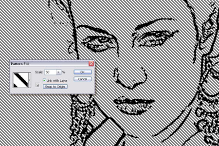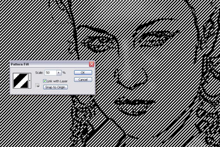 Intoarce-te la lucrarea de baza si asigura-te ca layer-ul negru (cel de dedesubtul celui cu efect Photocopy) este selectat. Apoi mergi la butonul jumatate alb/jumatate negru (aflat in subsolul paletei de layer-e) si alege comanda Pattern. Acum selecteaza imprimeul Thin Lines. Daca se impune, scaleza (micsoreaza) imprimeul in asa fel ca sa se potriveasca cu imaginea ta. Pentru cele mai bune rezultate, scaleaza (micsoreaza) imprimeul prin fractiuni (50 %, 25 % si asa mai departe) si pastreaza imprimeul (pattern-ul) cat mai mare cu putinta. (Eu am scalat (micsoreaza) pattern-ul la 50 %.) Clic OK atunci cand ai terminat.