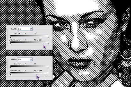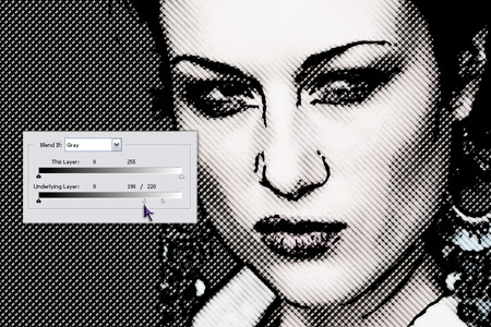 In paleta de layer-e, da dublu clic la dreapta numelui celui mai nou layer, pentru a deschide caseta de dialog Layer Style. La fel ca mai inainte, schimba modul de combinare a layer-ului (Blend Mode) pe Multiply. Apoi ajusteaza cursorul alb numit Underlying Layer dupa cun iti palce. Eu am ales combinatia Alt+tragere iar triunghiul alb se desparte in doua si adu-le pana la valoarea 190 / 220. Apoi am dat clic pe OK. Oricare ar fi setarile tale, Photoshop-ul combina imprimeul cu linii de sens contrar, creand astfel un efect de hasurare incrucisata.