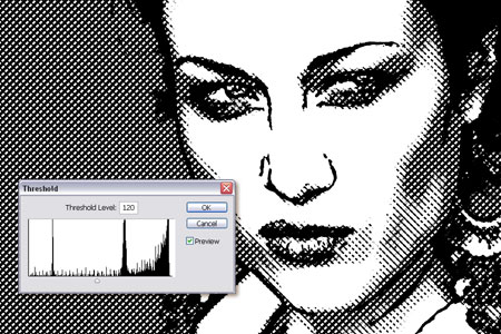 Cea mai buna cale este aceasta: Clic pe layer-ul cel mai de sus (in paleta de layer-e) pentru a-l face activ. Apoi clic pe butonul jumatate alb / jumatate negru (aflat la subsolul paletei de layer-e) si alege comanda Threshold. Ajusteaza valoarea lui Threshold Level pentru a crea un balans ideal de alb si negru. Apoi da clic pe OK.