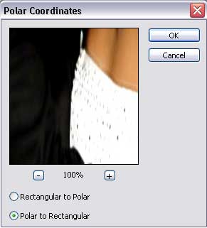4. Sa incepem sa reconstruim efectul. Mergi la Filter > Distort > Polar Coordinates si selecteaza Rectangular to Polar. Ar trebui sa-ti rezulte ceva asemanator cu imaginea de mai jos.