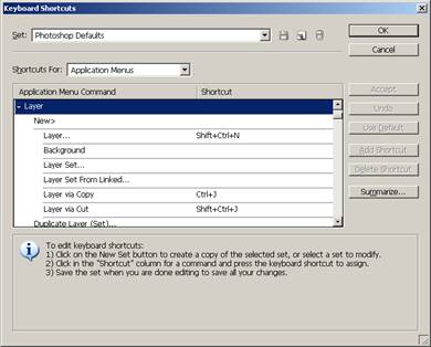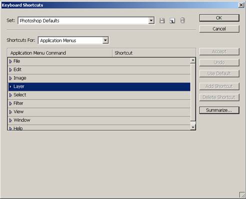 2 Keyboard Shortcuts. Pentru lucrul din tastatura aplicatia Adobe Photoshop pune la dispozitia utilizatorului interesat toate Short-cut-urile disponibile dar si posibilitatea de a-si adauga sau schimba optiunile oferite de aceasta aplicatie. Meniul Edit – Keyboard Shortcuts are ca si combinatie de taste Alt+Ctrl+Shift+K.