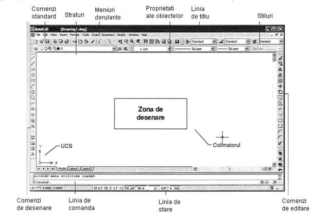 Ecranul afisat în mod implicit la lansarea programului este prezentat în fig. 1. În cadrul ecranului grafic AutoCAD se disting mai multe zone: