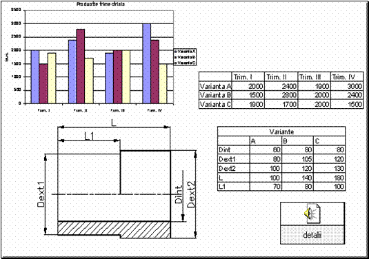 Figura 17.1 Exemplu de fisier‑desen AutoCAD incluzand obiecte create cu alte aplicatii Windows: foi de date Excel, grafic Excel, fisier audio