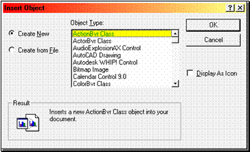 Comanda INSERTOBJ realizeaza importul de obiecte OLE, fie prin relatia "link", fie prin relatia "embed". Comanda activeaza caseta de dialog "Insert Object", pentru exprimarea optiunilor privind tipul si provenienta obiectului vizat (fig. 17.2).