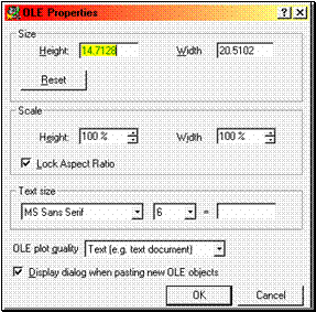 Dupa furnizarea informatiilor necesare in faza descrisa, programul deschide o noua caseta de dialog, "OLE Properties" (fig. 17.3), prin care se enunta caracteristicile dimensionale si calitatea plotarii obiectului legat/fixat.