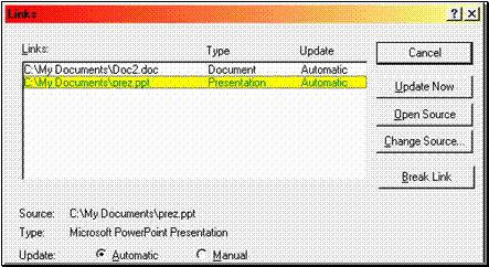 Comanda OLELINKS opereaza asupra legaturilor existente in desen ca urmare a includerii unor obiecte OLE prin relatia "link". Legatura poate fi actualizata, modificata, anulata. Comanda este disponibila numai daca in desen exista cel putin un obiect legat. OLELINKS activeaza o caseta de dialog (fig. 17.4), prin care se specifica legatura, tipul si locatia prezenta a obiectului legat, precum si operatia efectuata asupra legaturii.
