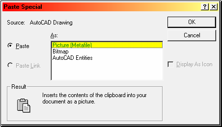 Comanda PASTESPEC are rol similar cu PASTECLIP, dar solicita prin caseta "Paste Special" (fig. 17.5) informatii detaliate privind formatul informatiei inserate in desen.