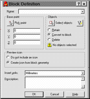 Grupul de optiuni "Objects" este destinat alegerii din desen a obiectelor ce urmeaza sa compuna blocul. Obiectele originale indicate la crearea blocului pot fi pastrate în desen ca atare, prin optiunea Retain, pot fi convertite într-o instantiere (inserare) a blocului respectiv, prin optiunea Convert to block, sau pot fi eliminate din desen dupa crearea blocului, prin optiunea Delete.