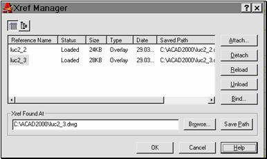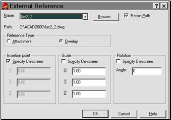 Pentru a crea o referinta externa în desenul curent, este disponbila comanda XATTACH. Aceasta deschide caseta de dialog din fig. 9.7. Este necesara o mare atentie în a nu crea referinte externe ciclice, de tipul "desenul A desenul B . desenul A"!