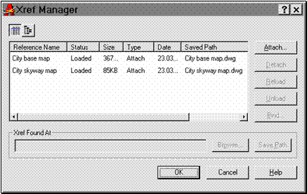 Pentru a controla referintele externe, se poate apela comanda XREF, care deschide caseta "Xref Manager" (fig. 9.8). Caseta este accesibila si din meniul pull-down "Insert", linia Xref Manager. Caseta vizualizeaza referintelor încapsulate (în mai multe trepte) sub forma arborescenta.