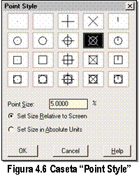 Marcarea punctelor în desen poate fi mai evidenta sau mai discreta. Tipul si marimea marcajului sunt stabilite prin caseta "Point Style." (fig. 4.6), deschisa prin comanda DDPTYPE, sau din meniul pull-down "Format", linia "Point Style."