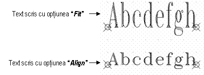 Alinierea între doua puncte a unui text "single line" prezinta doua variante (fig. 4.8): varianta "Fit", în care se pastreaza înaltimea si se deformeaza caracterele pe orizontala pentru a fi potrivite între punctele specificate, si varianta "Align", în care caracterele sunt scalate proportional, astfel încât textul respectiv sa încapa între cele doua puncte.