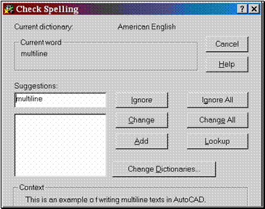 Pentru verificarea ortografica a textelor, AutoCAD dispune de un corector de tip "spelling". Acesta poate fi apelat prin comanda SPELL sau din prima linie a meniului pull-down "Tools". Verificarea este aplicata în raport cu o anumita limba nationala selectata în acel moment. Este necesar sa se dispuna de fisierele-dictionar pentru limba vizata. Caseta de lucru pentru spelling este prezentata în fig. 4.12. Facilitatea de spelling lucreaza si în AutoCAD ca si în aplicatiile de procesare a textelor (Word, WordPerfect, etc.).