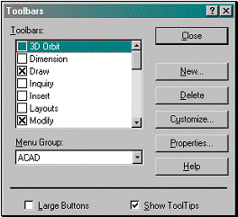 Figura 1.5 Caseta de dialog "Toolbars", apelabila prin comanda TOOLBARS