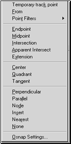 Butonul drept al mouse-ului poate lucra si īn combinatie cu tastele <Shift> si <Ctrl>. Īn acest caz, prin apasarea simultana a combinatiei <Shift> + butonul drept - sau <Ctrl> + butonul drept al mouse-ului, este activat meniul flotant pentru lucrul cu modurile Osnap (fig. 1.10).