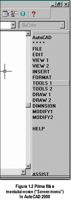 Īn dreapta ecranului, poate fi vizualizat optional meniul-ecran (fig. 1.2), organizat arborescent, pe mai multe file de meniuri si submeniuri. Revenirea la fila principala a meniului-ecran este posibila oricānd prin selectarea liniei, AutoCAD, care ramāne vizibila pe orice fila. Prin comanda OPTIONS utilizatorul poate sa decida prezenta sau absenta meniului-ecran.