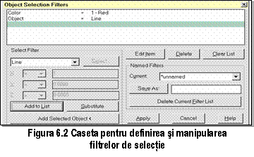 Comanda FILTER activeaza caseta de dialog "Object Selection Filters", (fig. 6.2), care permite constructia filtrelor de selectie. Proprietatea sau proprietatile care definesc filtrul sunt alese dintr-o lista de optiuni a casetei. În alcatuirea listei de proprietati, pot fi folosite si functii logice de tipul: AND, OR, XOR si NOT. Un exemplu de constituire a unei liste de filtrare este prezentat în continuare:
