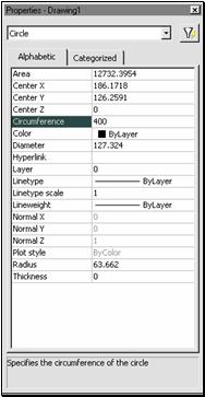 Obiectul vizat pentru editare poate fi selectat anterior comenzii, prin grips-uri, sau dupa declansarea acesteia. AutoCAD deschide o fereastra similara cu fereastra de proprietati din Visual Basic. Liniile acesteia sunt variabile, în functie de obiectul selectat. În fig. 6.30 este ilustrat un exemplu corespunzator unui obiect de tip cerc. Modificarea valorii unei proprietati în aceasta fereastra conduce la modificarea corespunzatoare a obiectului din desen. Schimbând de exemplu valoarea ariei, cercul se redimensioneaza prin modificarea razei pentru a corespunde noii valori.
