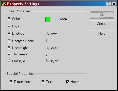 Pentru controlul proprietatii sau proprietatilor care se împrumuta de la obiectul-sursa, comanda are prevazuta optiunea "Settings". Aceasta deschide o caseta de dialog (fig. 6.31) pentru alegerea proprietatilor împrumutabile. Caseta prezinta doua zone, cea a proprietatilor generale ("Basic properties"), adica tip de linie, culoare, etc., si cea a proprietatilor speciale ("Special properties"), adica stilul de cotare, stilul de scriere, modelul de hasurare.