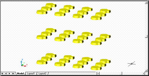 In multiplicarea rectangulara spatiala (fig.14.48), randurile sunt paralele cu axa X curenta, coloanele cu axa Y, iar nivelele cu axa Z. Comanda solicita selectarea setului de obiecte supus multiplicarii, numarul de randuri, de coloane si de nivele si distanta dintre fiecare din ele.