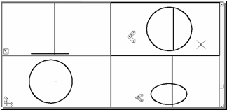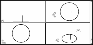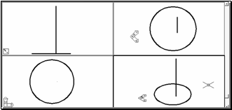 In fig. 14.52 a, este redat un exemplu privind diferitele optiuni de proiectie in comenzile TRIM si EXTEND. Sunt considerate doua obiecte, un cerc in planul XY si un segment de dreapta vertical, perpendicular deci pe planul XY, in interiorul cercului. Cele doua obiecte nu se intersecteaza in spatiul 3D. Aplicarea variantei "None" a modului de proiectie nu modifica in nici un fel obiectele prin TRIM sau EXTEND. Nici varianta "Ucs" nu produce modificari, deoarece proiectiile celor doua elemente pe planul XY nu se intersecteaza. Pe vederea izometrica de SE din dreapta‑jos se poate aplica varianta "View". In fig. 14.52 b este exemplificata aplicarea comenzii TRIM cu modul de proiectie "View" pentru aceasta vedere. Linia pare retezata pana la cerc. In fig. 14.52 c se aplica comanda EXTEND pe aceleasi obiecte originale, cu optiunea de proiectie "View" pe vederea spatiala oarecare din dreapta-sus. Linia pare ca atinge cercul.